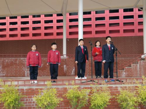 Dear teachers and friends, I'm Wang Yuantao from Prejunior One. It's great honor to be here today. Since entering this school, I have learned a lot and also made much progress. Many thanks for offering me such good environment. I not only learn many subjects in different classes, but also do some sports, play the piano and so on after class. I really like this school because the school life is colorful. Right now I stand in the blue sky, watching the flag rising slowly. I'm so happy. Hope I can be excellent in such a nice school. Thank you !